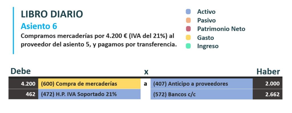 A nuestro proveedor anterior le compramos mercaderías que pagamos por transferencia. Pero debemos recordar que ya le hicimos entrega de un anticipo de 2.420€ en el asiento anterior.